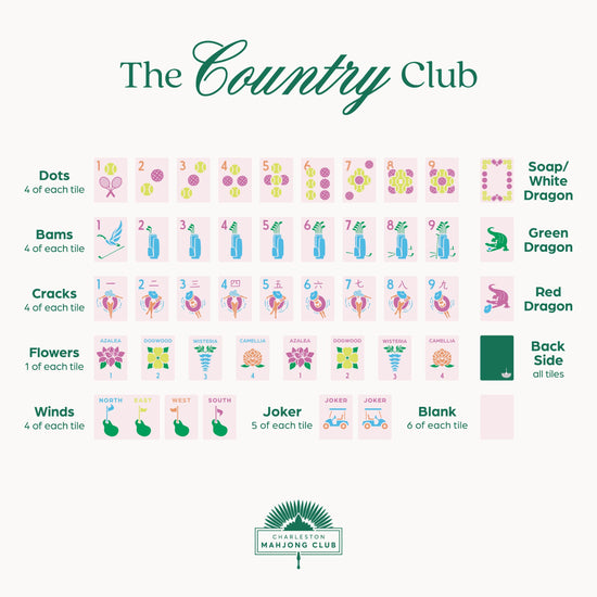 Experience the elegance of country club life with Charleston Mahjong Club's tile set! This tile set is perfect for any mahjong enthusiast who appreciates the sophistication and traditions of a country club lifestyle. Play mahjong with style and enjoy a touch of country club charm in every game.